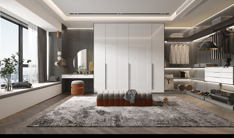 Wardrobe-34 Cloakroom is an important indicator of the quality of life, but also contains the variety of life. Through the use of materials, colors and the collocation of soft clothing, the light luxury style is created incisively and vividly. At the same time, glass, metal and other materials are cleverly used to broaden the visual sense and show the harmony of light and shadow, creating the elegant magic of the heart, making fashion and light luxury become a highlight of the space.