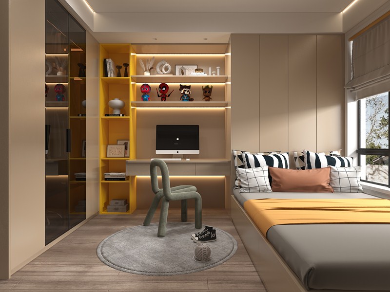 Children room-1 Adopting the layout idea of "integrating all parts", the children's bed, wardrobe, desk and other furniture are placed against the wall, to give the middle area more space as children's activity venue. Develop your child's independence by exploring the environment freely and dealing with the trifles of life. Simple atmosphere of color, more conducive to the cultivation of children's aesthetic, the formation of a comfortable space atmosphere, and not outdated, and a variety of age can match, not because of the growth of age and appear too childish.
