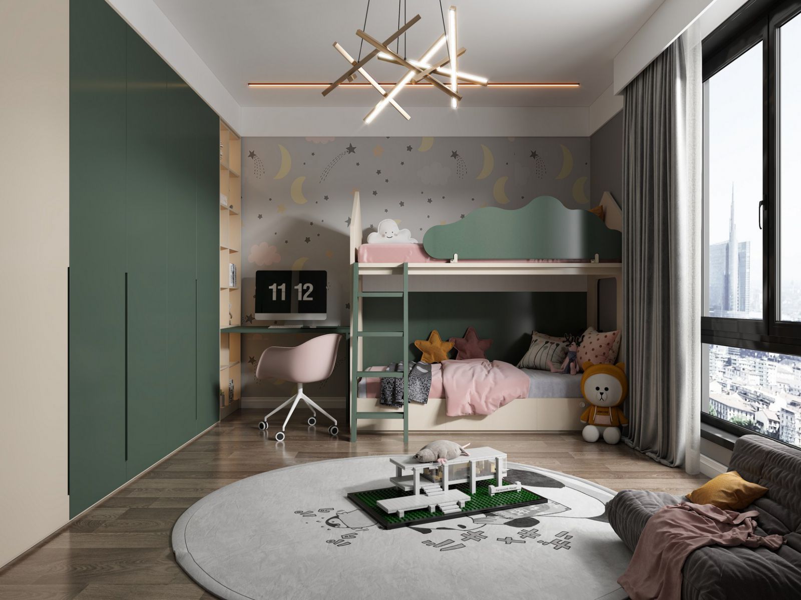 Children room-2 Adopting the layout idea of "integrating all parts", the children's bed, wardrobe, desk and other furniture are placed against the wall, to give the middle area more space as children's activity venue. Develop your child's independence by exploring the environment freely and dealing with the trifles of life. Simple atmosphere of color, more conducive to the cultivation of children's aesthetic, the formation of a comfortable space atmosphere, and not outdated, and a variety of age can match, not because of the growth of age and appear too childish.